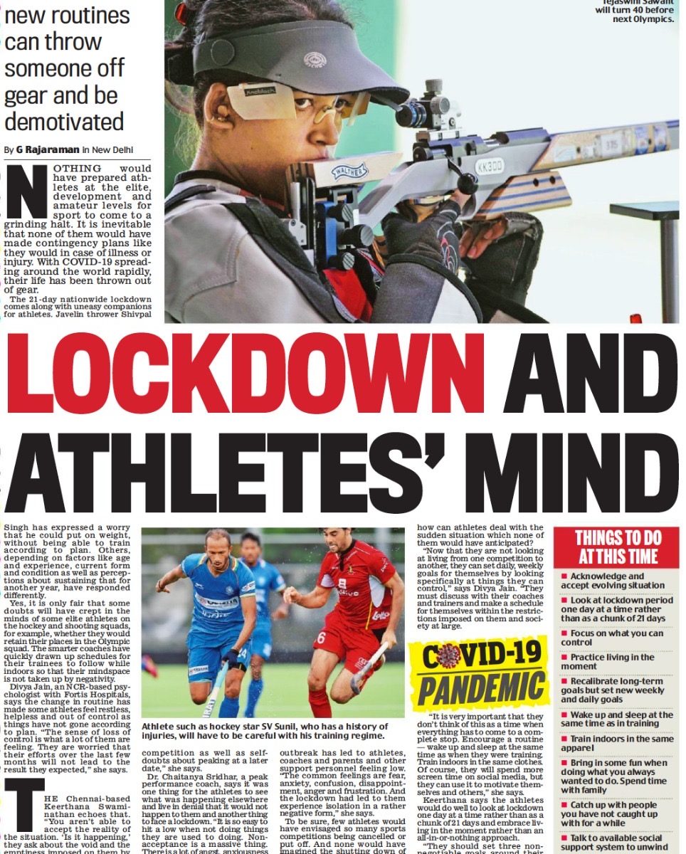 “When you are dealing with athletes, you can broadly divide them in three categories — the elite, the ones who are at national level aspiring to make it and the next group is academy bunch. The reaction to lockdown will be different,” said Dr Sridhar, who is associated with JSW Sports and has worked with ”GoSports” Foundation and IPL franchise RCB.